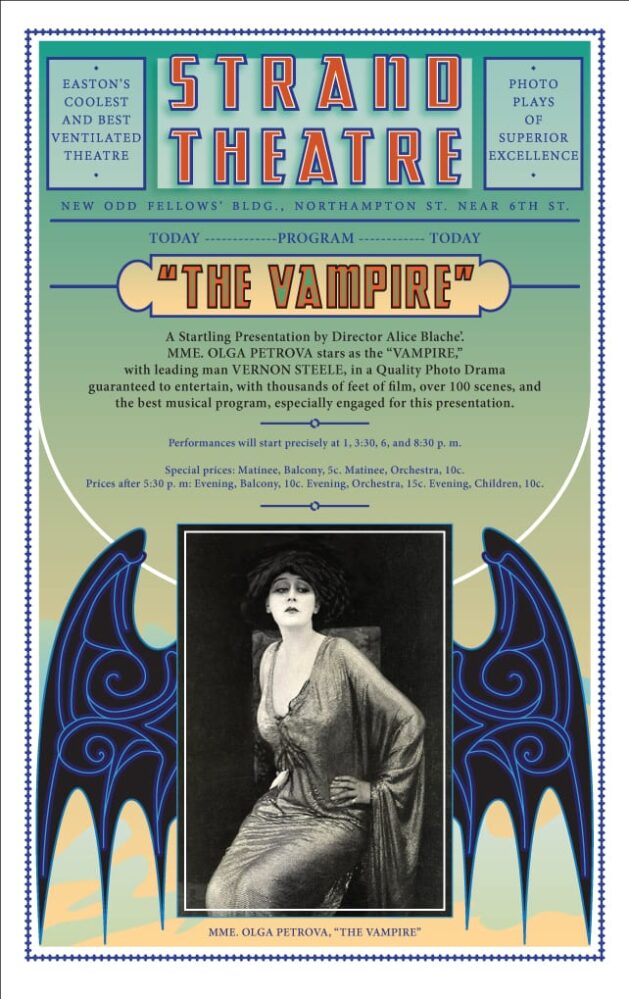 Pictured at left is a modern movie poster highlighting a film that showed on August 26th, 1915, “The Vampire,” starring acclaimed actress Olga Petrova.
