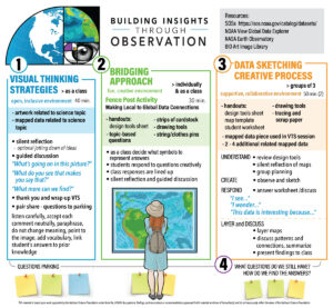 Innovations in data collection, infrastructure, and visualization play an important role in modern society. Large, complex datasets are accessible to and shared widely with the public. However, students need to learn how to interpret and reason about visualizations of scientific data. This project uses geospatial visualizations along with arts-based pedagogies for observing, analyzing, and critiquing visual features of data visualizations to help students develop critical thinking skills and practices required to effectively make meaning from authentic scientific data. We are working with 10 middle school science teachers from across the country to develop tools for STEM educators to use these data visualizations effectively. This project focuses on visual thinking skills that have been found to apply in both science and art: describing, wondering, recognizing uncertainty, and interpreting with evidence.