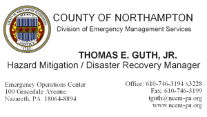 Thomas E. Guth, Jr. is Northampton County’s Hazard Mitigation / Disaster Recovery Manager since January 2018 and has been with the County’s Emergency Services division (EM / 911) since May of 2007. As the Hazard Mitigation contact he is responsible for co-chairing the bi-county Lehigh Valley Hazard Mitigation Plan (LV HMP) and ensuring satisfactory participation from the thirty-eight municipalities and the county during all plan updates. In addition to the LV HMP work I also assist municipalities and non-profits with grants and grant submissions annually including applying for mitigation grants. This entails coordinating mitigation efforts within the County during Hazard Mitigation Grant Program opportunities such as for DR-4506 (COVID) and DR-4618 (TS Ida). Under the disaster recovery responsibilities he is responsible for oversight and coordination of recovery efforts at the County level and works with all thirty-eight municipals, county residents, county businesses and the County agencies to collect, document and report damages after any catastrophic event. He has overseen the recovery efforts from FEMA Declared Disasters; DR-4408-PA, Severe Storms & Flooding; DR-4506-PA, PA COVID-19 Pandemic and DR-4618-PA, Remnants of Hurricane Ida all of which affected those within Northampton County. He also oversaw recovery assessments and efforts following widespread Tropical Storm Isaias with no formal disaster declaration being awarded. Tom is the current Secretary for the Northeast Pennsylvania Voluntary Organizations Active in Disaster (NEPA VOAD), Secretary for the Northampton County Local Emergency Planning Committee (LEPC) and a member of the Association of State Floodplain Managers.