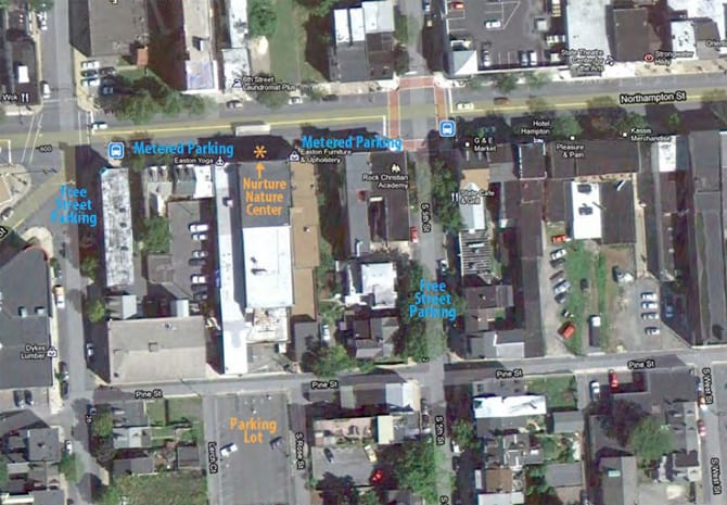 You may also park on Northampton Street in front of the building at metered spots that require two quarters per hour. Free on-street parking is also available on 5th and 6th Streets as shown below, about one half-block from the entrance of Nurture Nature Center. A city parking garage is located at 3rd and Pine Streets and you may park there all day and overnight. It is located about two and a half blocks from the Nurture Nature Center.