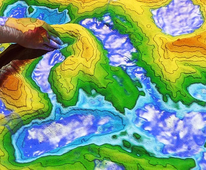 The Interactive Watershed Exhibit is an augmented reality sandbox that allows students to change a sand landscape and see how elevation (shown as colors) and contours change in response. Students can use clouds or their hands to create rain and see how water moves through the landscape. The program teaches watershed science, topography, hydrology, and geomorphology/landforms. An accompanying worksheet and activity are included as part of the program.
